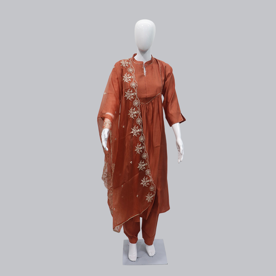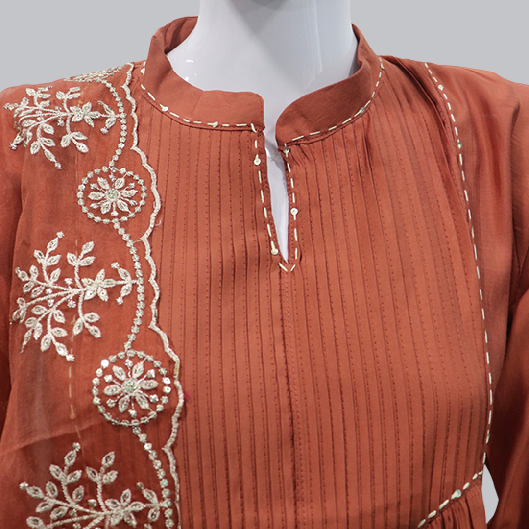 Enhance your ethnic wardrobe with this Rust Brown Embroidered Kurti Set with Dupatta from Gulorian. Crafted in rich, soft fabric, the kurti features fine thread embroidery around the neckline and sleeves, giving it a regal touch. The coordinated dupatta with detailed floral embroidery adds extra grace to the outfit. Ideal for festive gatherings, cultural events, or family functions, this ensemble blends tradition and style beautifully.
