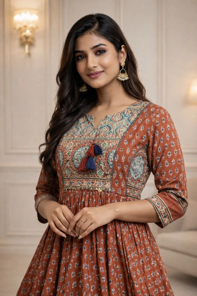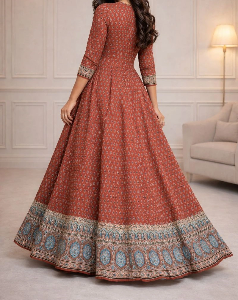 An elegant rust-colored long gown featuring all-over floral prints with intricate border detailing. Designed with a graceful flare and comfortable fit, this gown is perfect for festive occasions, casual gatherings, and refined everyday wear.