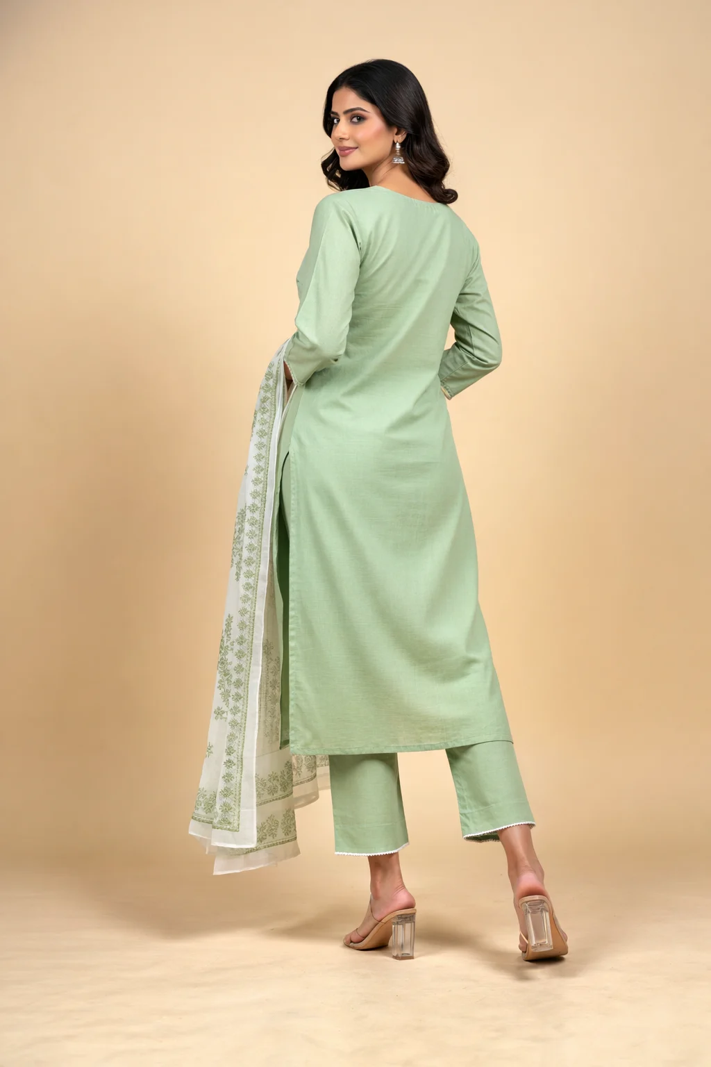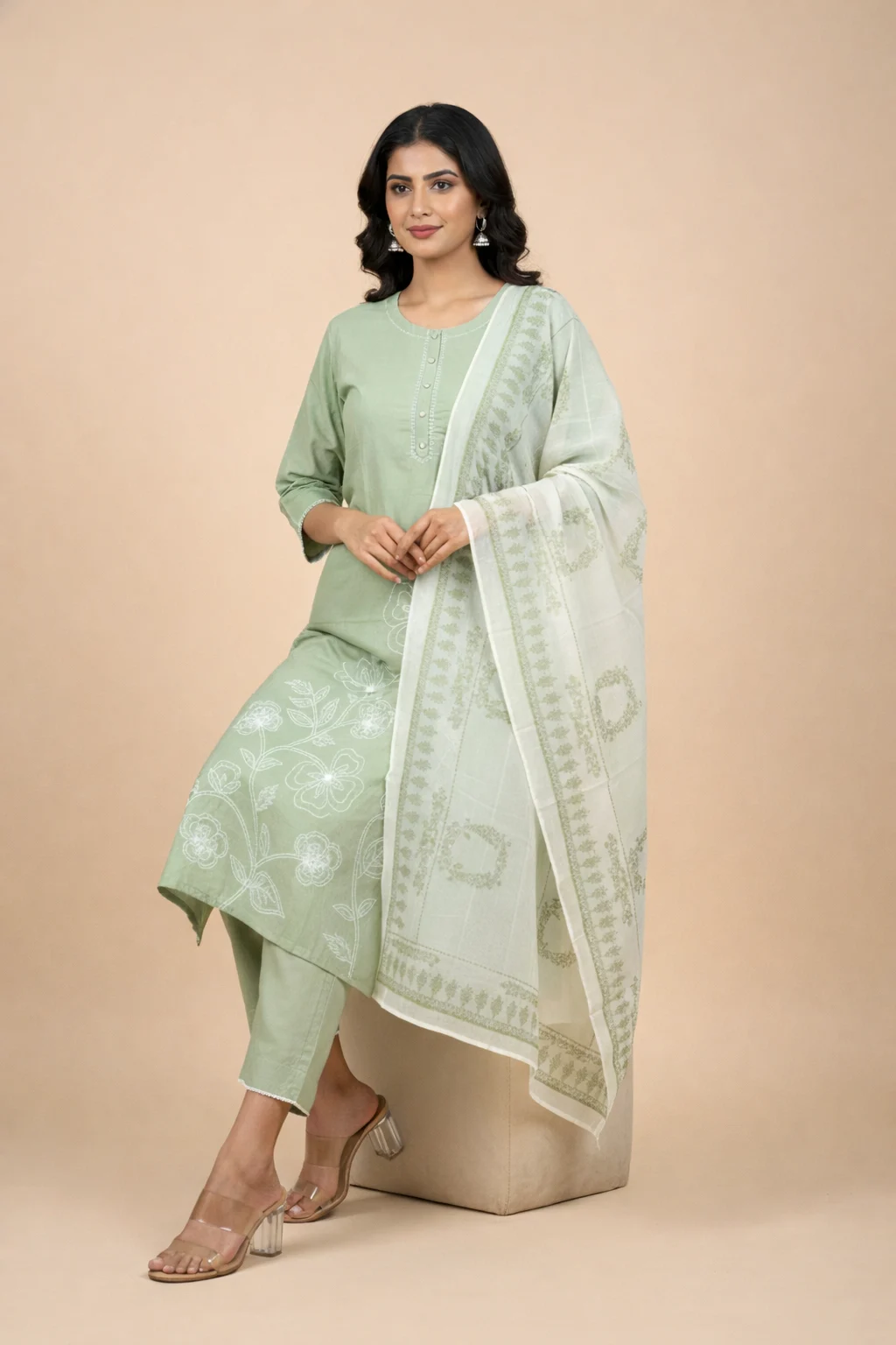Grace meets simplicity in this elegant sage green kurta set. Designed with delicate white floral embroidery and paired with a soft printed dupatta, this outfit offers a perfect blend of comfort and sophistication. Ideal for casual gatherings, festive moments, and everyday elegance.