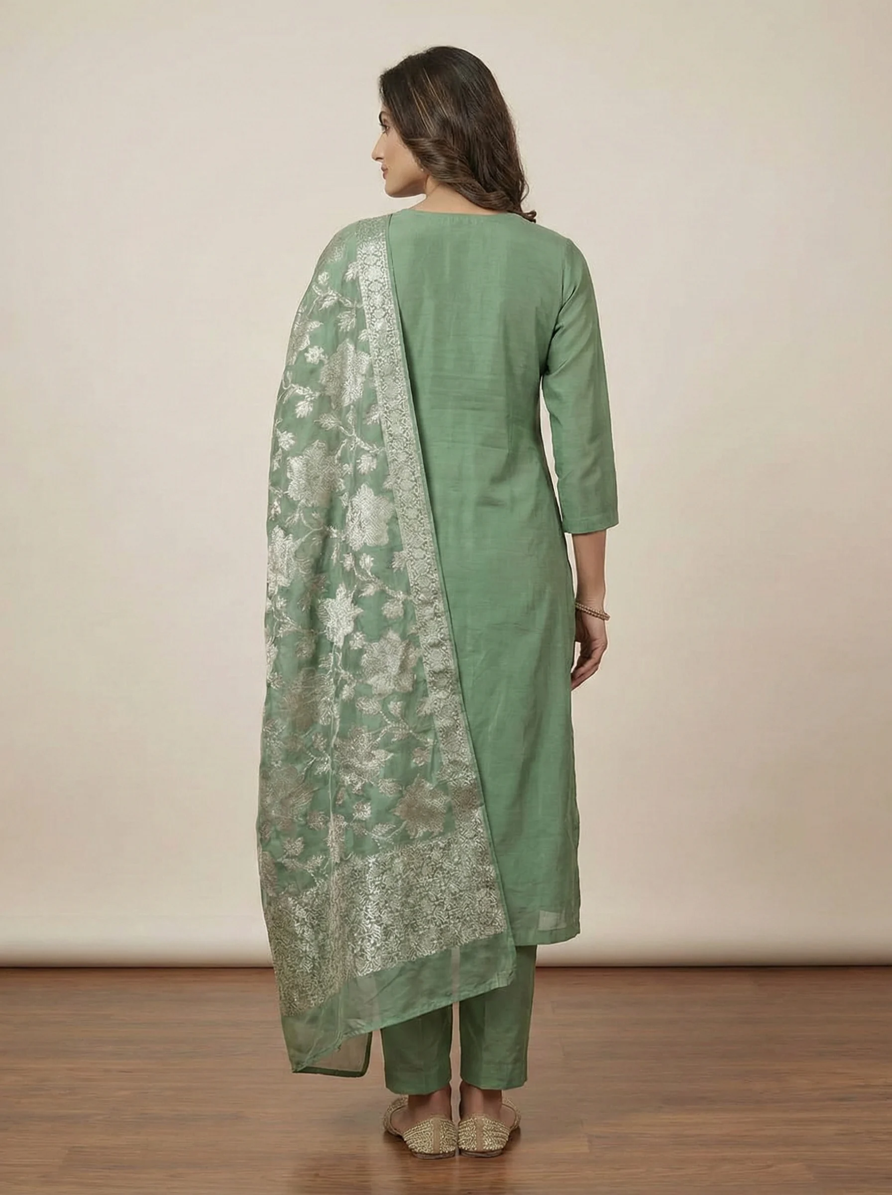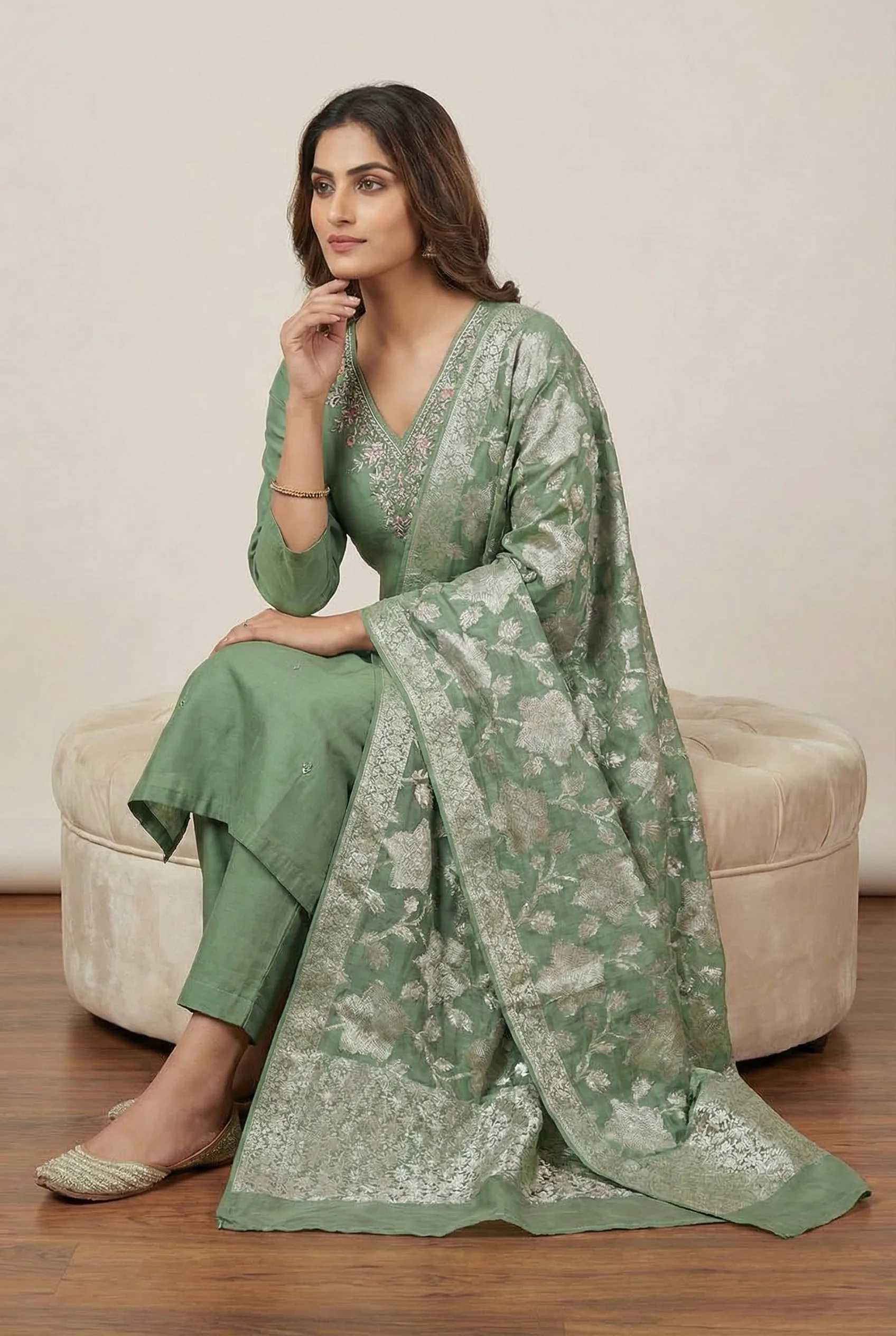A sophisticated sage green straight kurti featuring delicate neckline embroidery, paired with matching straight pants and a luxurious floral woven Banarasi dupatta. Perfect for festive and formal occasions.