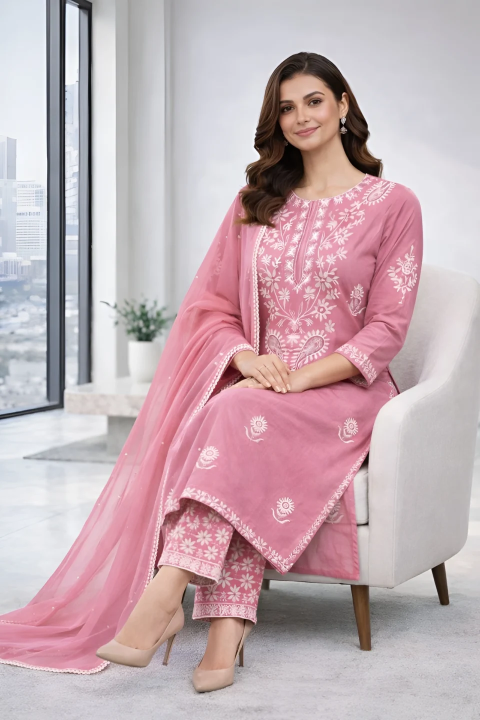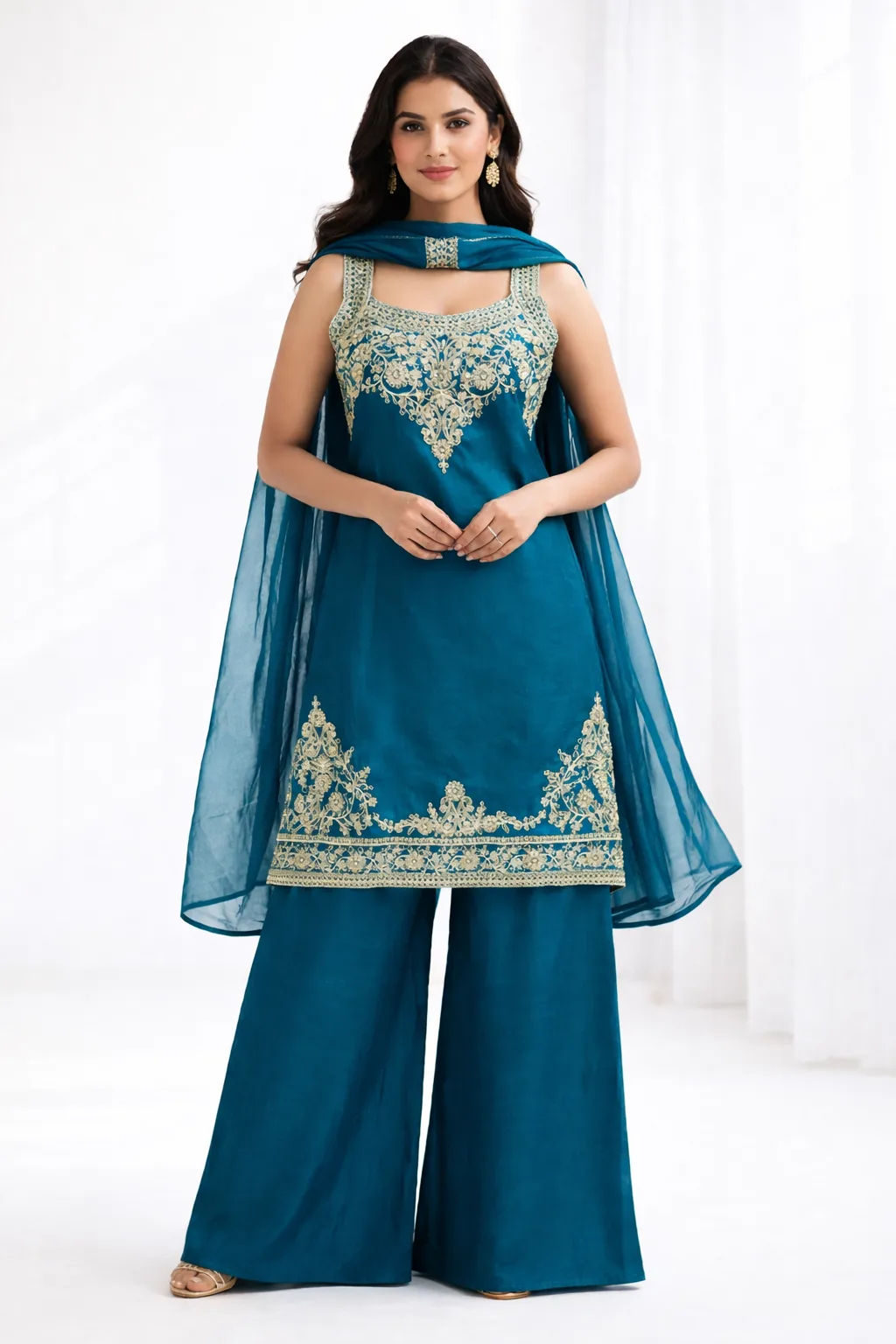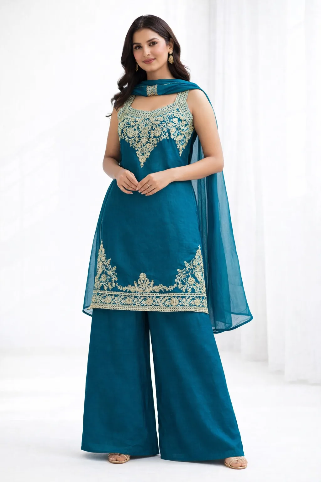 Graceful teal blue kurta set designed with intricate golden embroidery on the neckline and hemline. Paired with stylish wide-leg palazzo pants and a soft matching dupatta, this elegant outfit is perfect for festive occasions, wedding functions, and evening gatherings. A beautiful blend of tradition and modern charm.