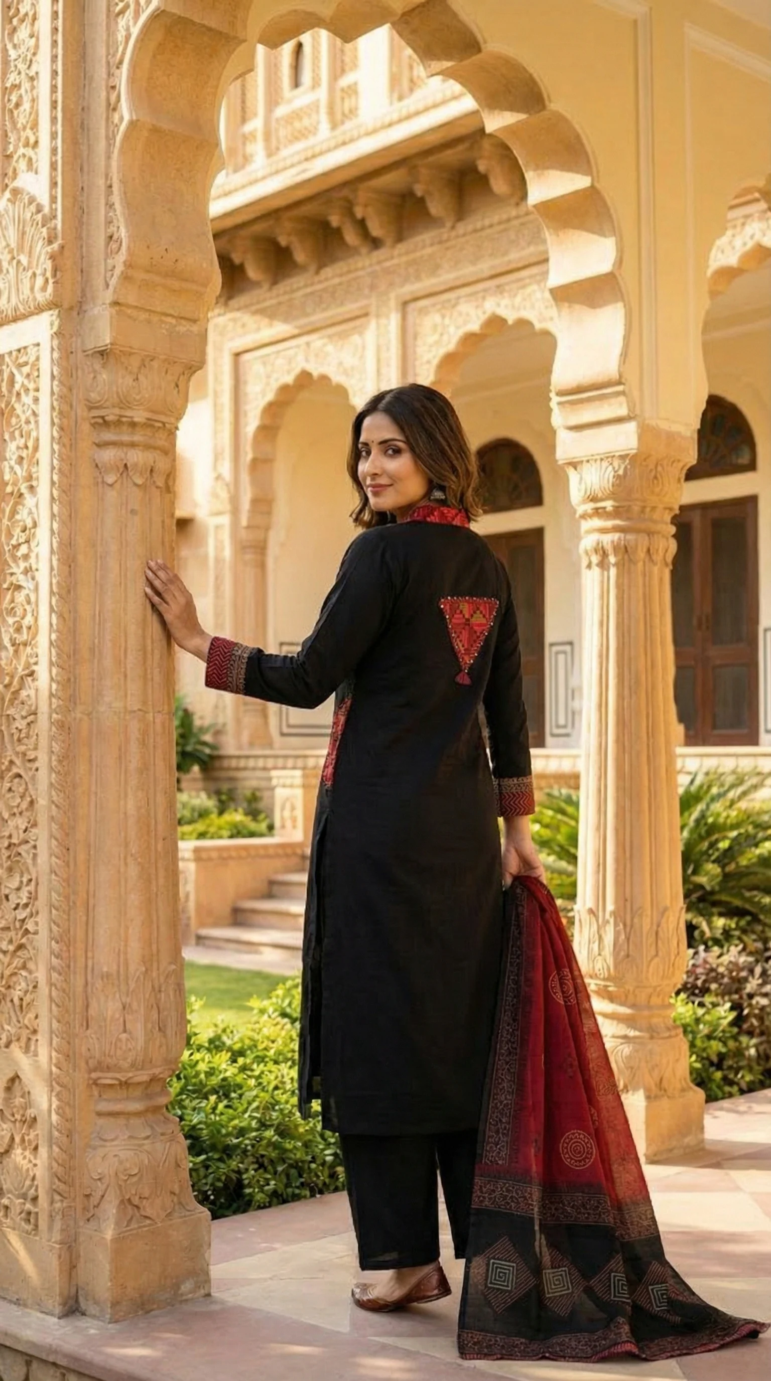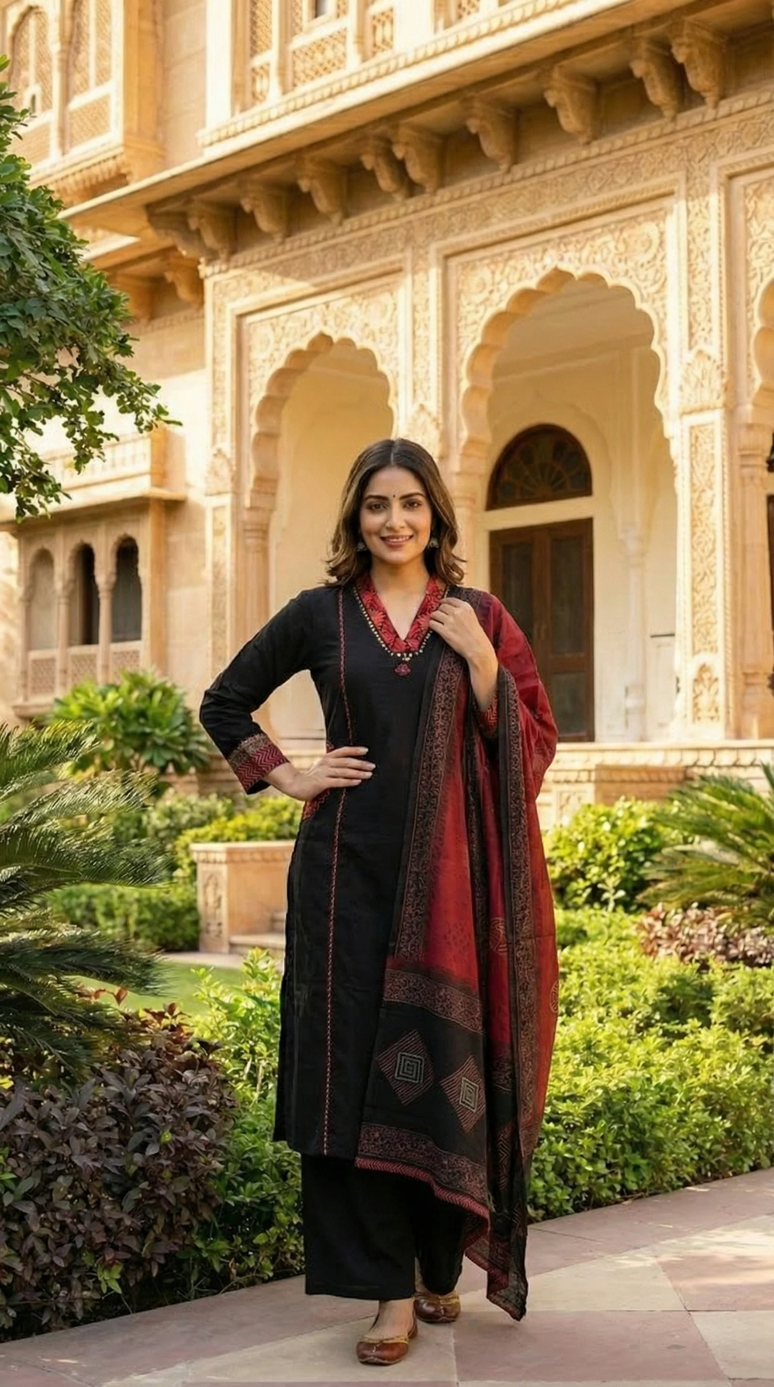 Elevate your ethnic wardrobe with this elegant 3-piece set. Featuring a premium black cotton-blend kurta with intricate V-neck embroidery, paired with comfortable wide-leg palazzos and a heritage-inspired maroon Ajrakh print dupatta. Perfect for festive gatherings or sophisticated office wear.