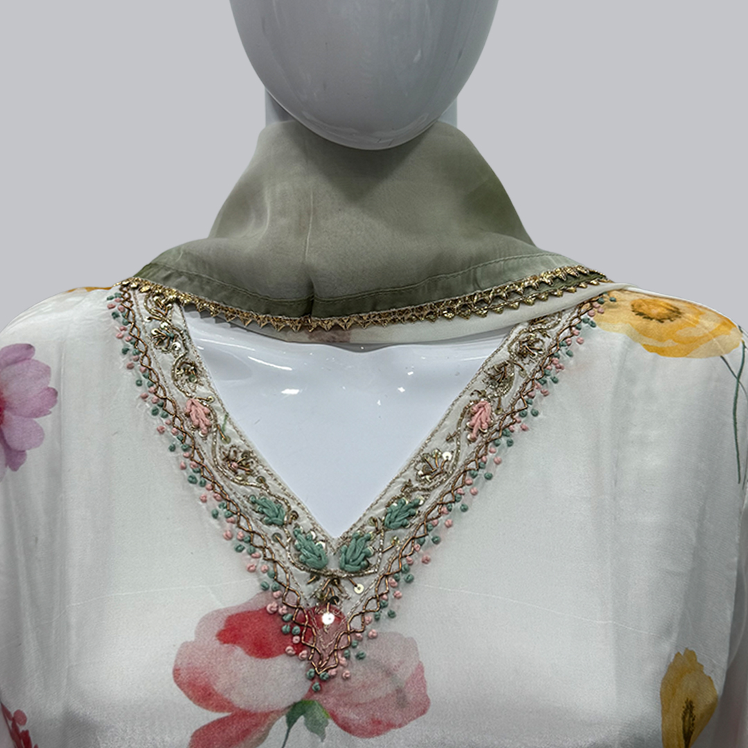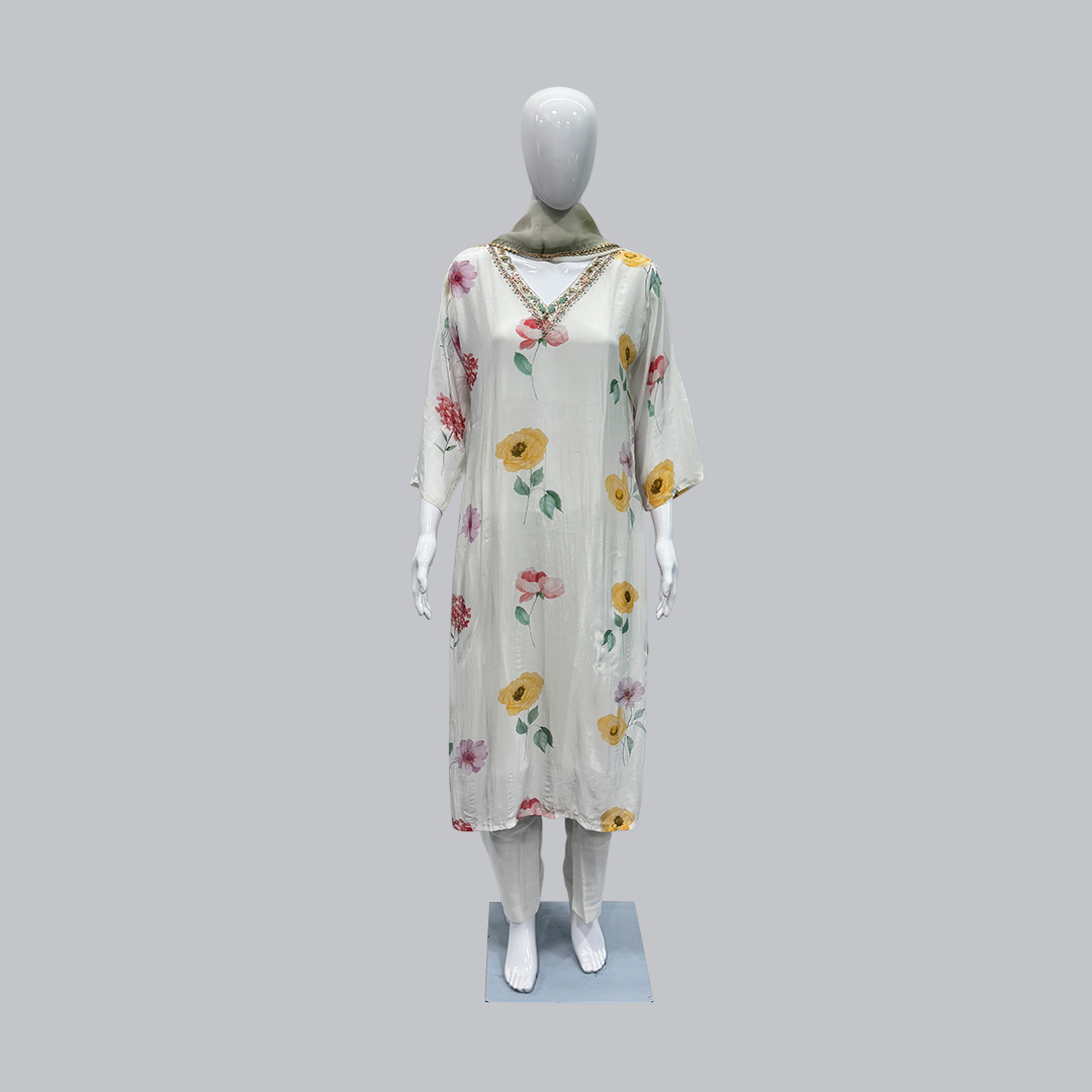Add charm to your ethnic wardrobe with this elegant white floral printed kurti set. Crafted from soft, flowy fabric, the kurti features a beautiful multicolor floral pattern, V-neckline with intricate lace detailing, and 3/4th sleeves for a graceful touch. The matching pant and dupatta complete the ensemble, making it ideal for casual outings, festive gatherings, or office wear. This outfit combines comfort, elegance, and subtle sophistication — perfect for every season.